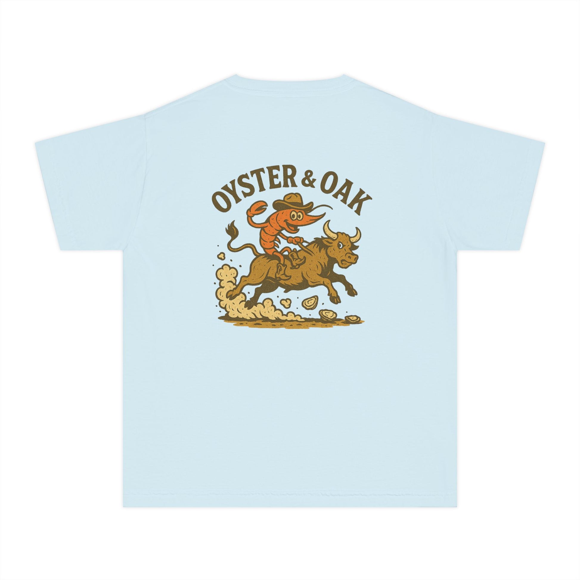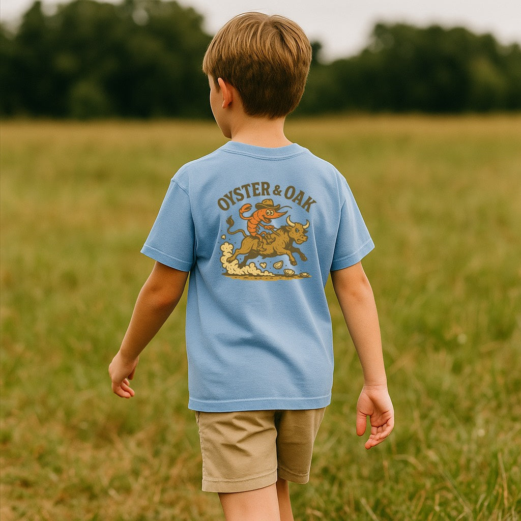 The Lil’ Shrimp Rodeo Tee brings Oyster & Oak’s Southern charm to kid-size. Soft, garment-dyed cotton with a relaxed fit — perfect for shrimp boils, dock days, and backyard adventures.