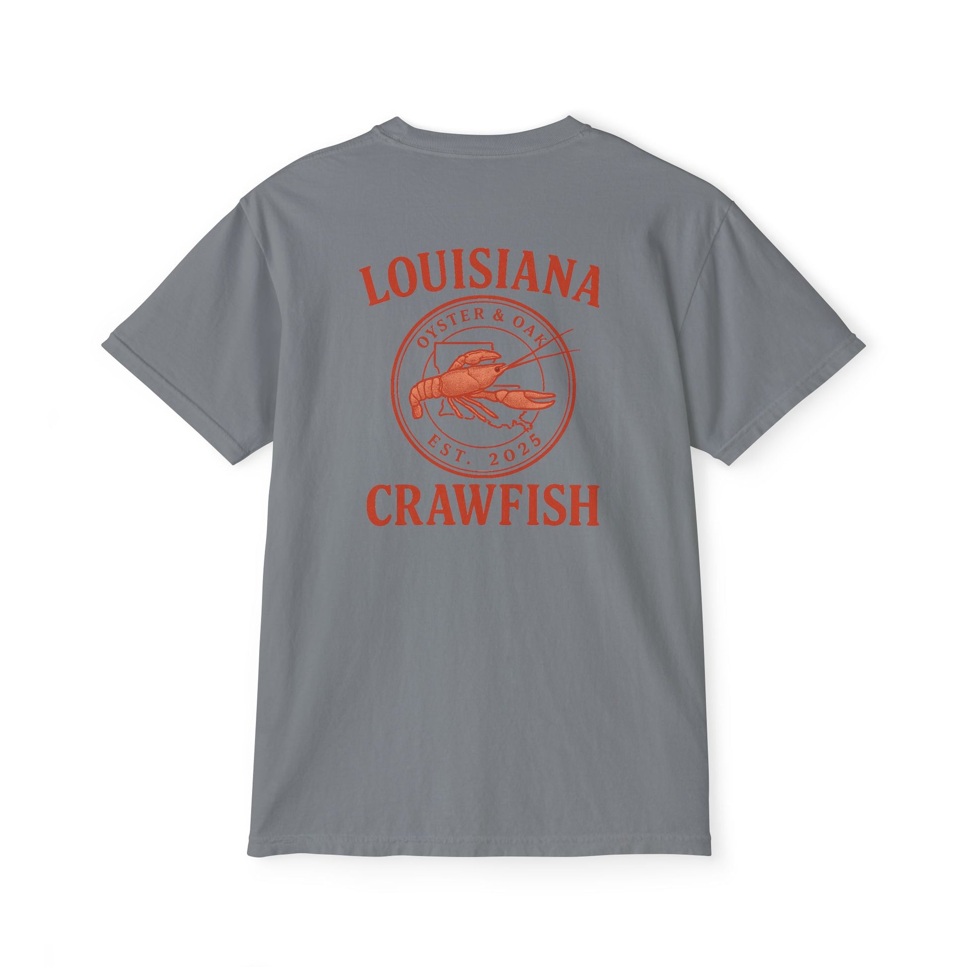 The Louisiana Crawfish Heritage Tee blends bold vintage typography with a classic Oyster & Oak touch — featuring the Louisiana outline and detailed crawfish emblem framed by Oyster & Oak · Est. 2025. Printed in warm, weathered red ink for that timeworn, festival-day feel.